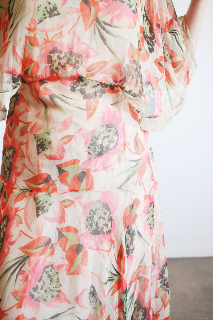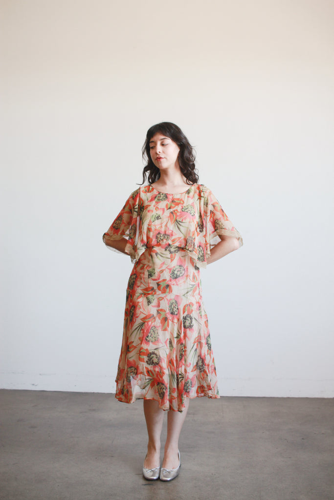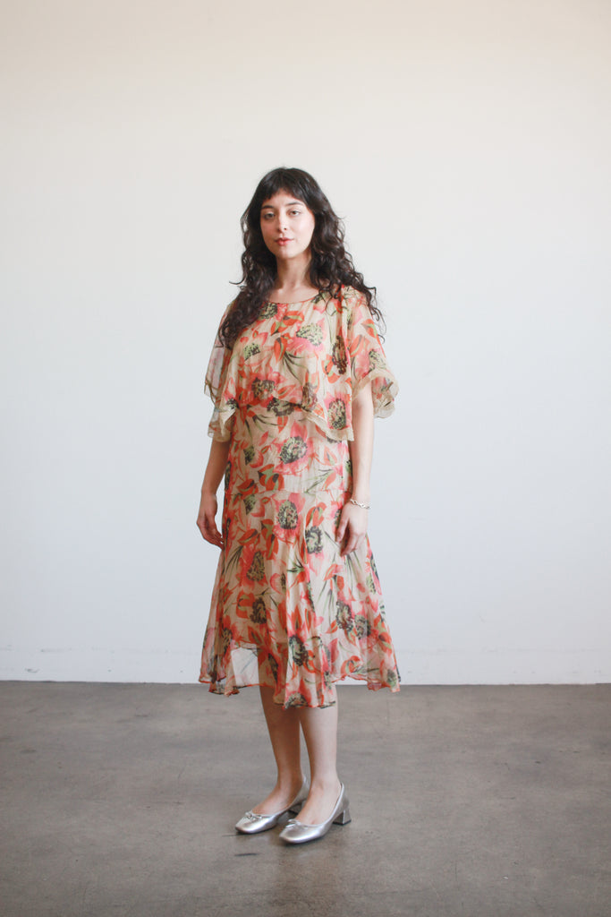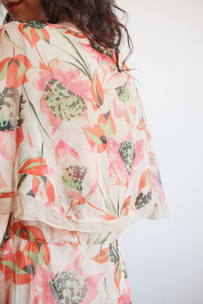 Circa 1920s. No label. Silk chiffon fabric. Lined. Fits modern 2/4 best. No closures. Great condition- some small holes and wear throughout; minor spots; mending with interfacing done along tear in capelet.