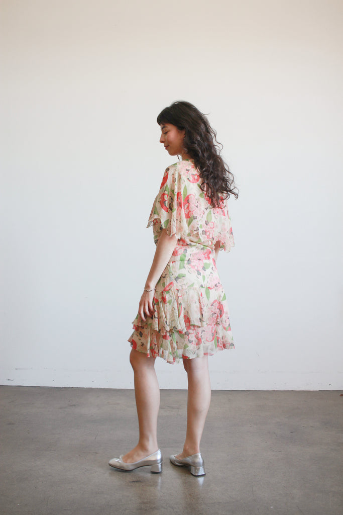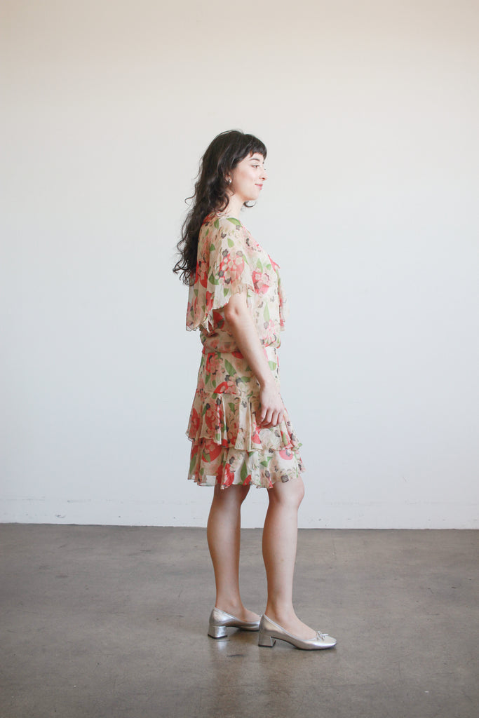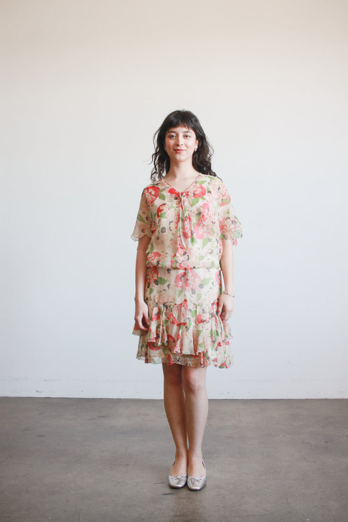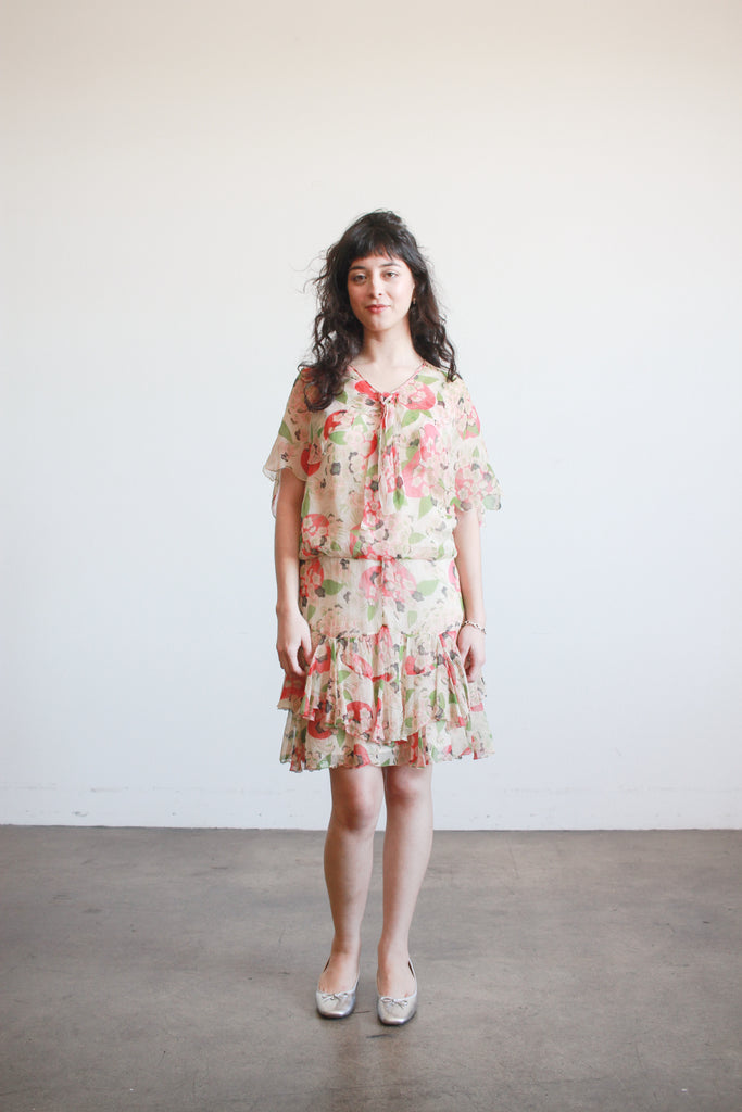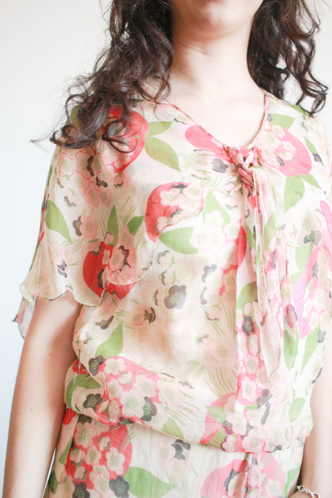 Circa 1920s. Silk chiffon. Fits up to modern M. Apple blossom motif throughout. Tie decoration along neckline. Tiered skirt. Lined. No closures. Great condition- minor discoloration consistent with age, some fraying and small holes along capelet.
