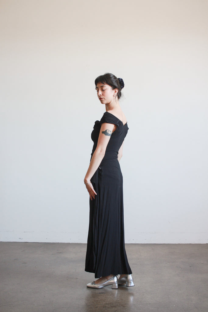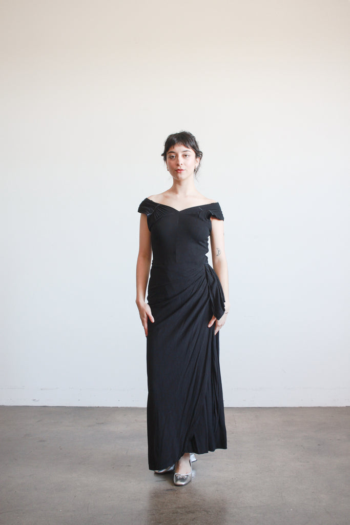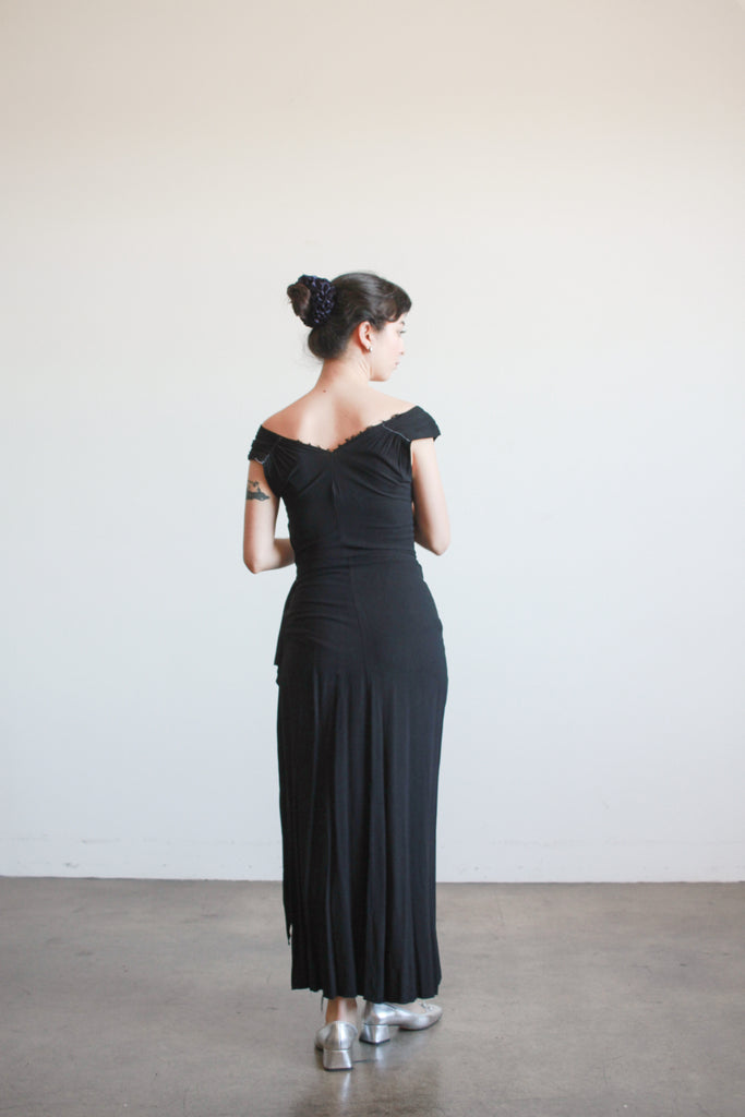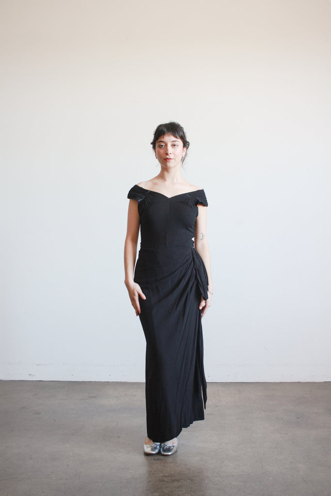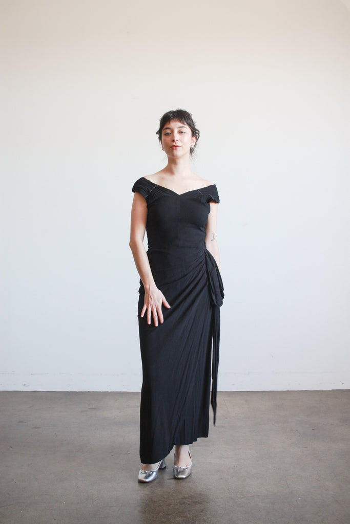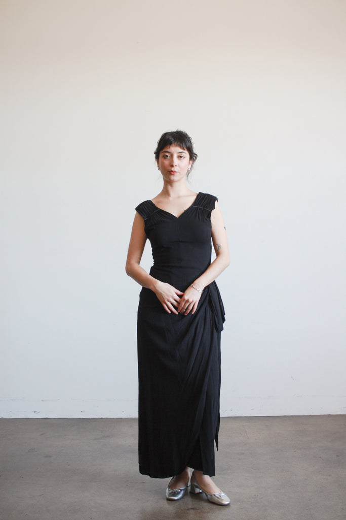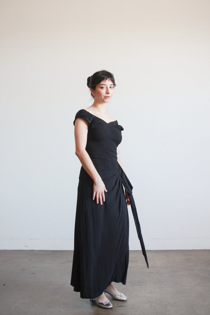 Circa 1930s. Crepe rayon fabric. Fits up to modern 0/2 best. Side metal zip closure. Draping along hip. Light blue stitching detail along shoulder. Great condition- minor wear no major flaws.