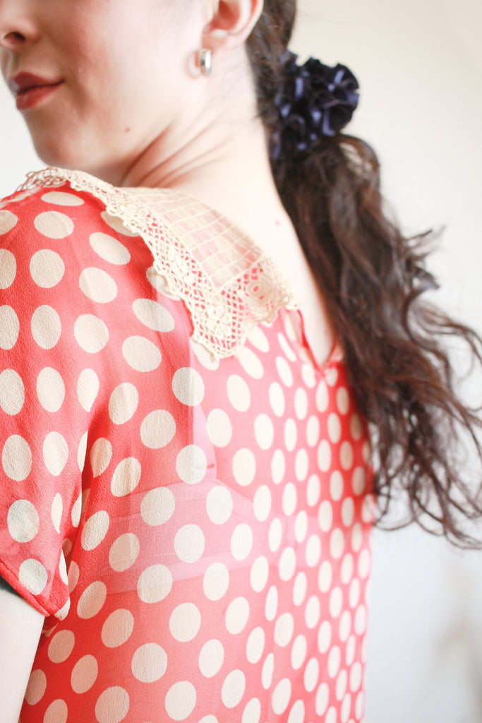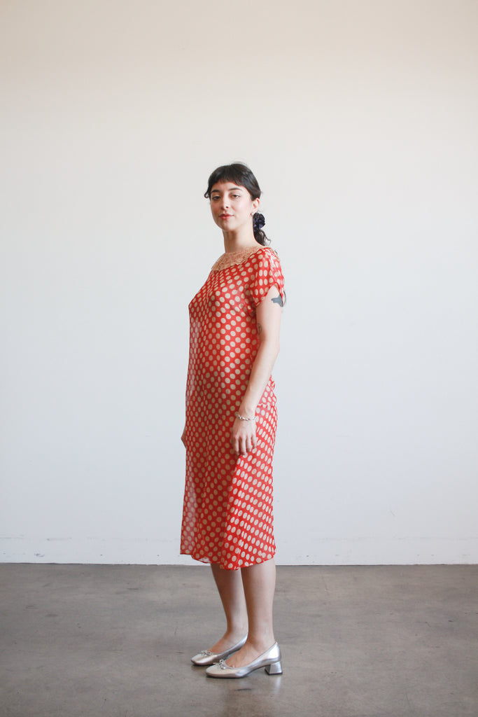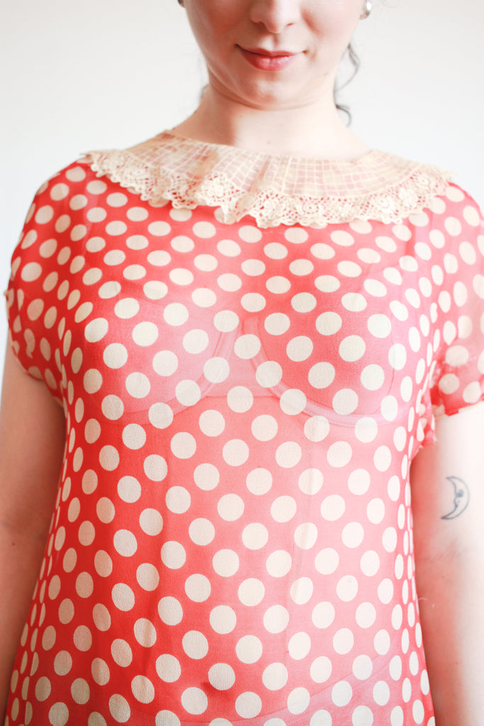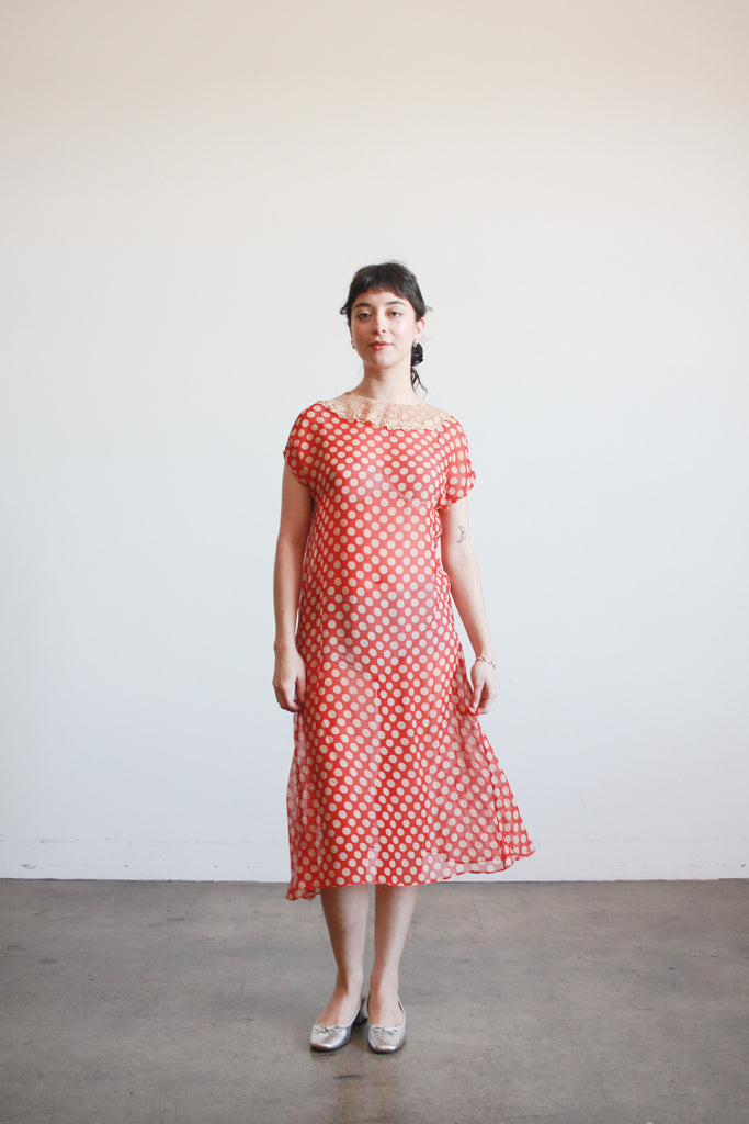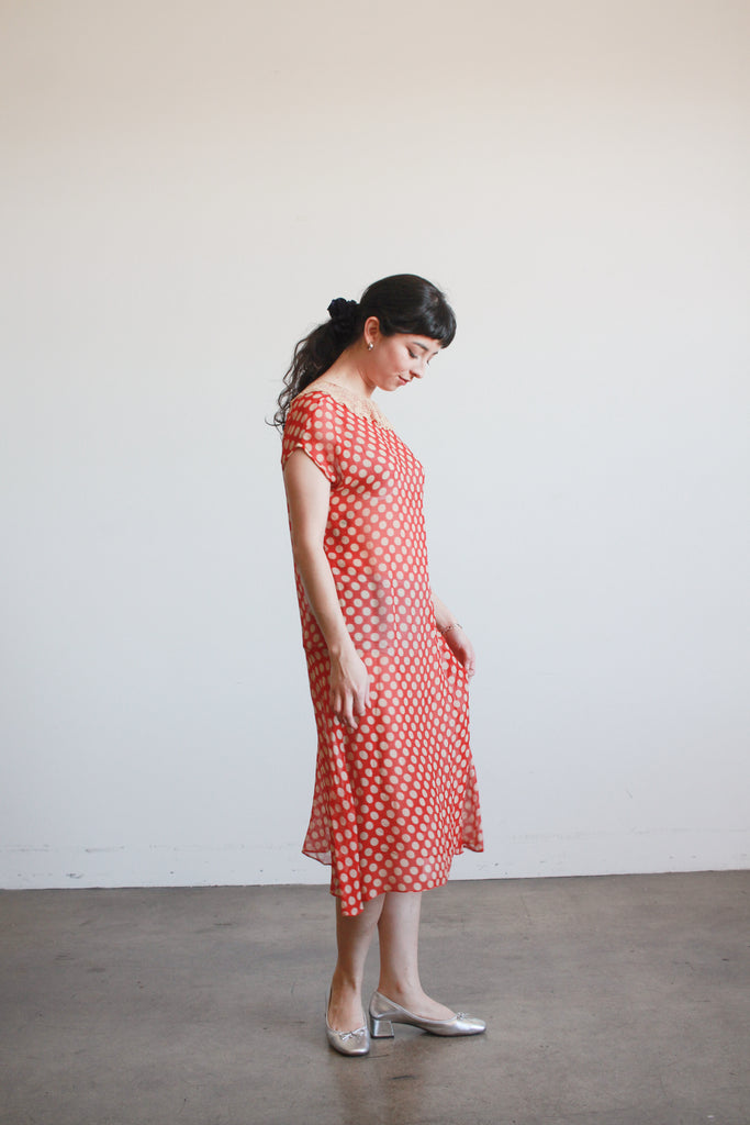 Circa 1920s. No label. Silk chiffon sheer fabric. Fits up to modern 2/4 best. Keyhole closure. Great condition- interface done along some tears along underarm and shoulder area; structurally wearable.