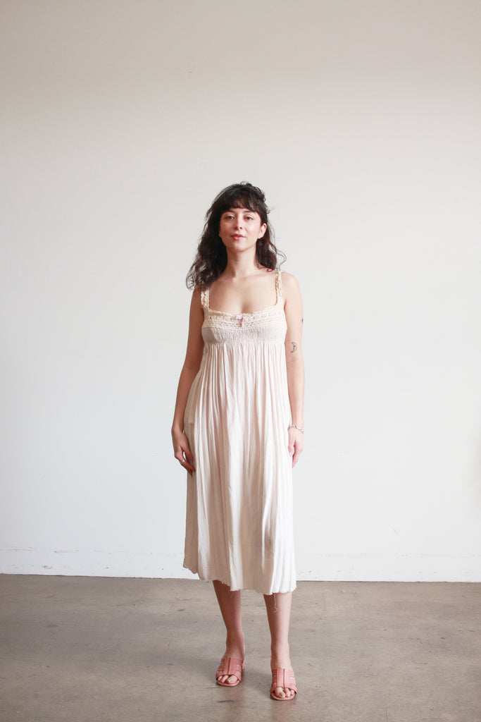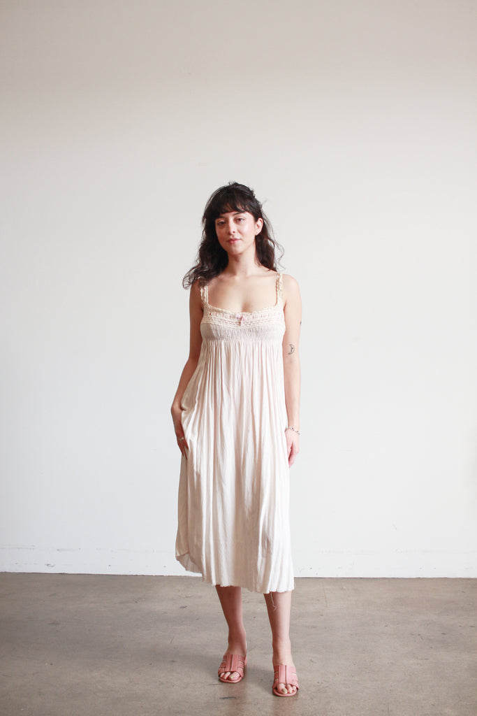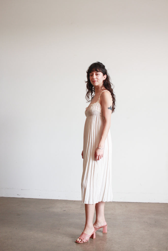 Circa 1950s. Cotton. Fits up to modern XS. Eyelet lace, smocking and threaded ribbon detail. Zipper, back button and clasp closures. Underwire along bust. Great condition.