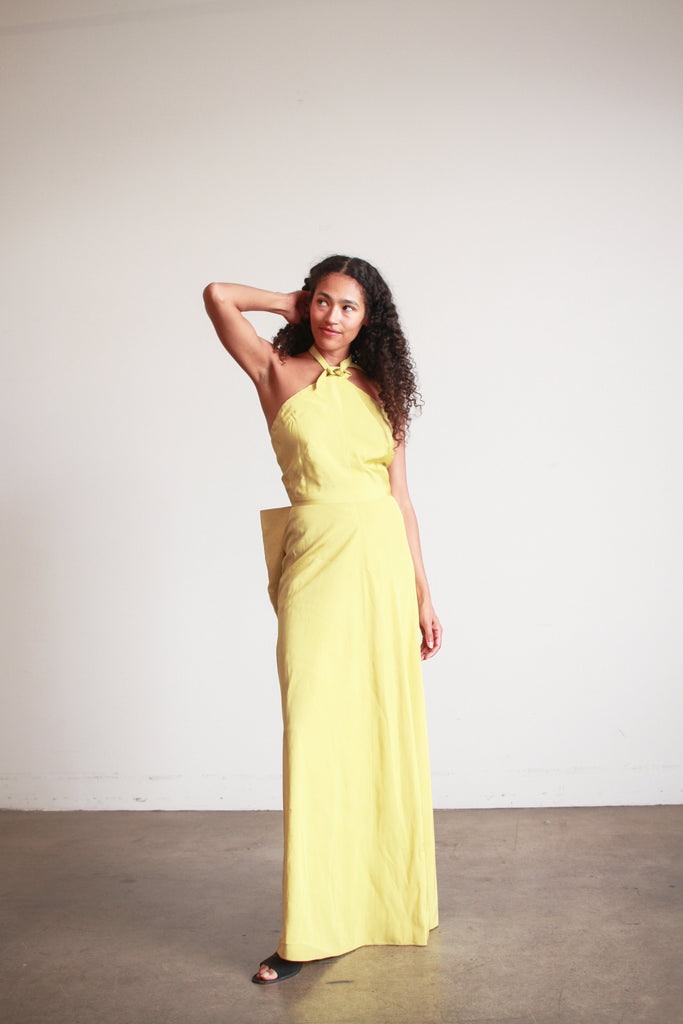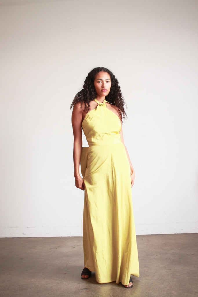 Circa 1950s. Silk taffeta. Fits up to modern S. Halter neckline, back zipper closure. Bustle detail. Excellent condition.