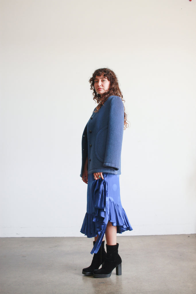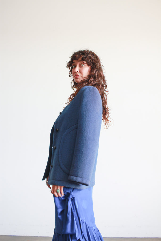 Circa 1960s. Wool fabric. Fits up to modern M. Front button closures. Zip pockets with geometric stitching. Great condition- some fading along shoulders and arms.