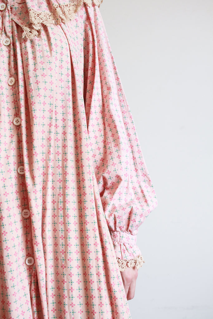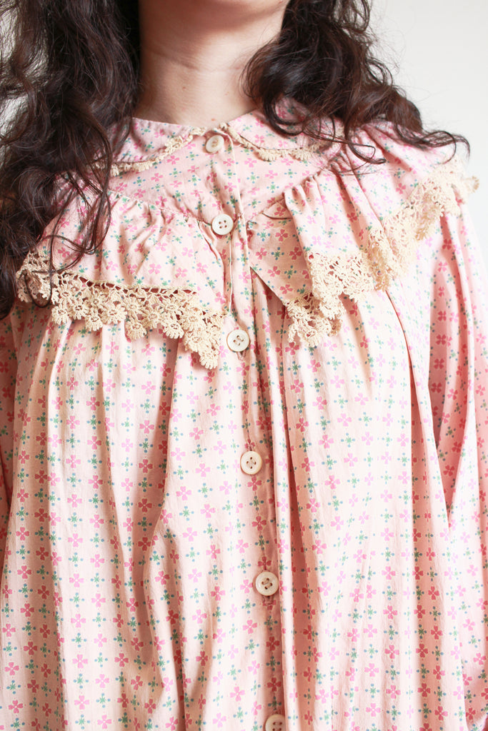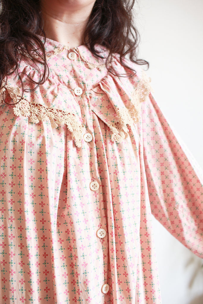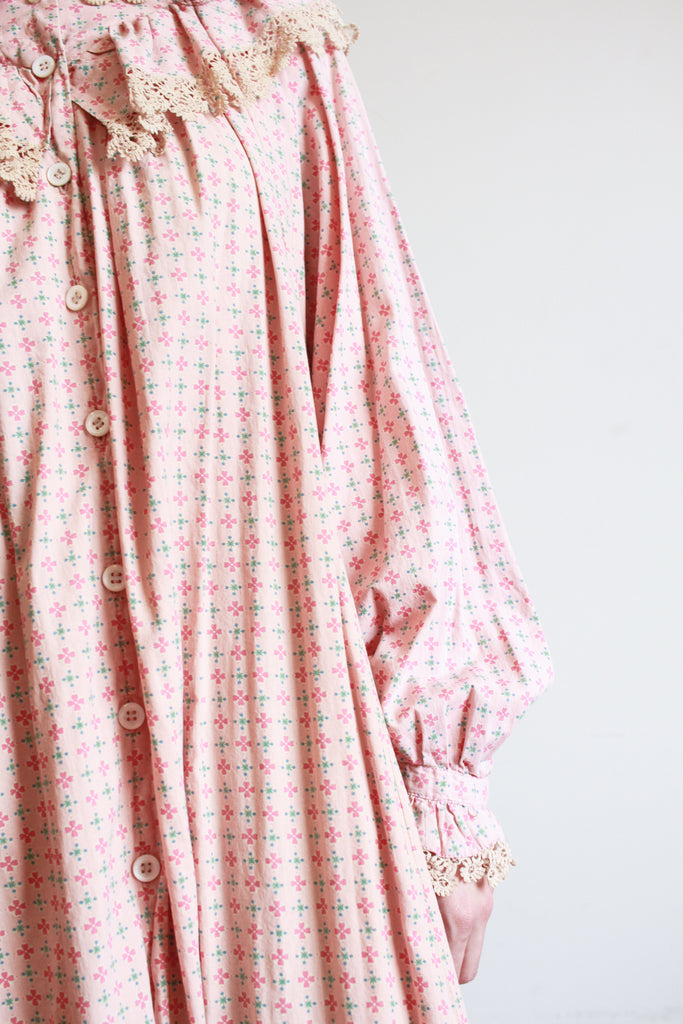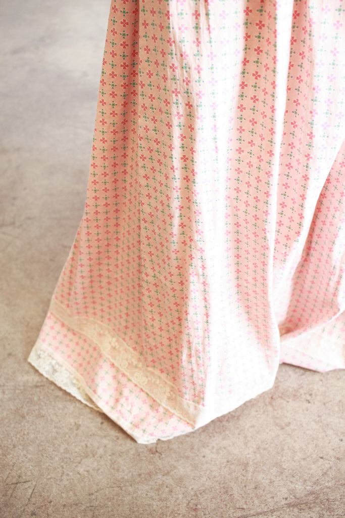 Circa 1800s. Cotton. Fits most sizes. Crochet trimmed bib collar. Button and clasp closures. Pink, blue, green calico print throughout. Lace trimmed skirt hem. Handwritten CRC W. Excellent condition.