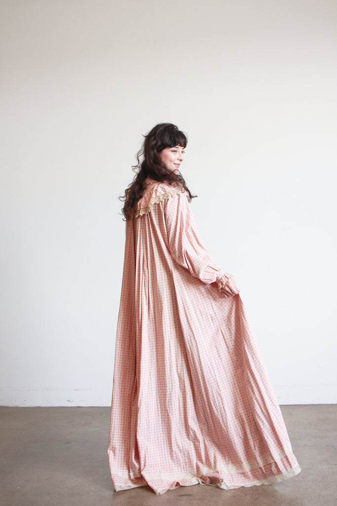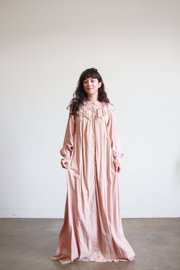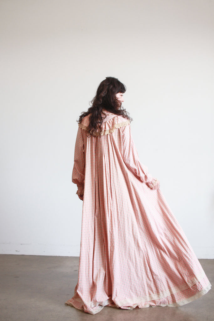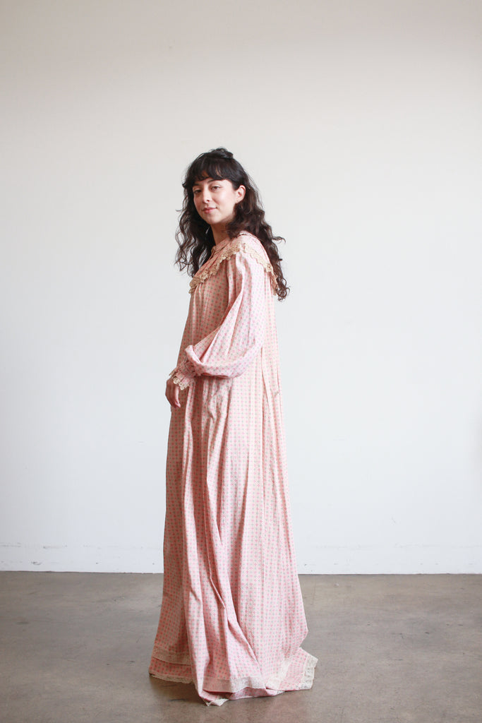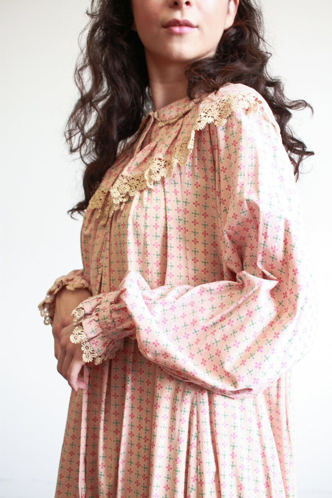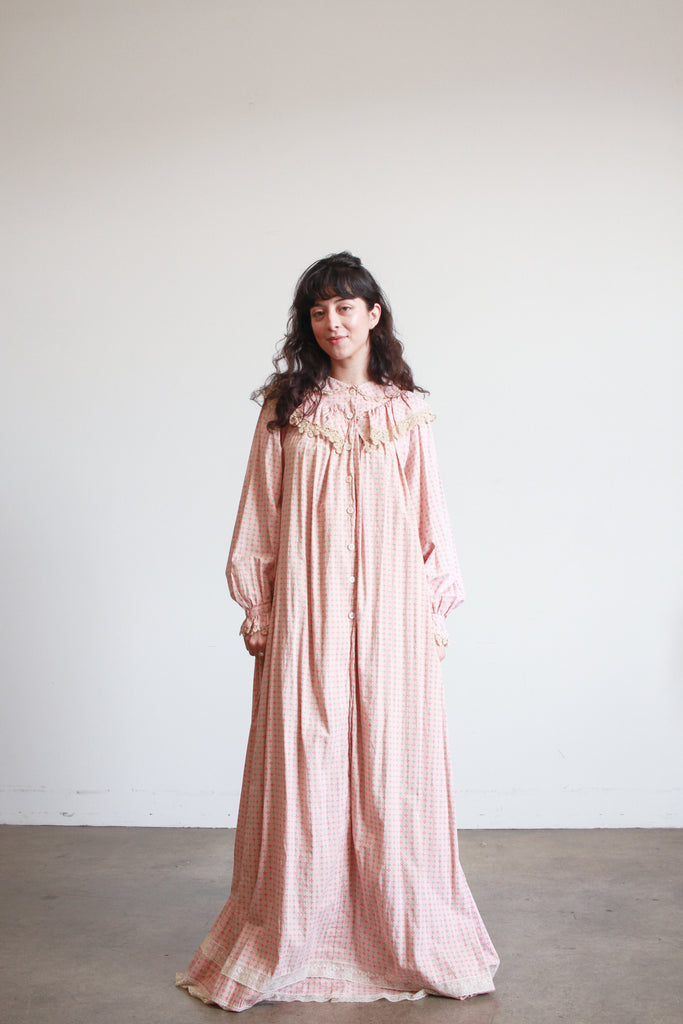 Circa 1800s. Cotton. Fits most sizes. Crochet trimmed bib collar. Button and clasp closures. Pink, blue, green calico print throughout. Lace trimmed skirt hem. Handwritten CRC W. Excellent condition.