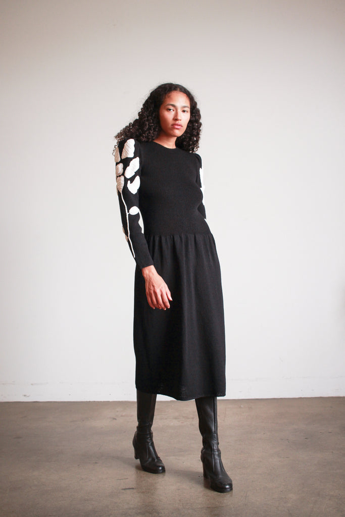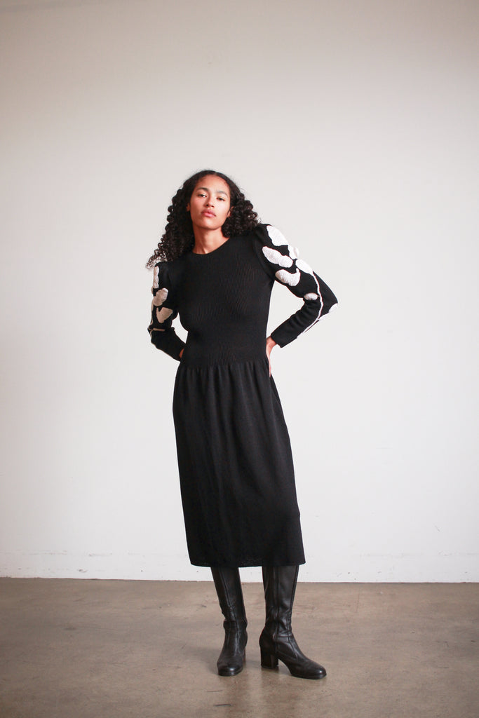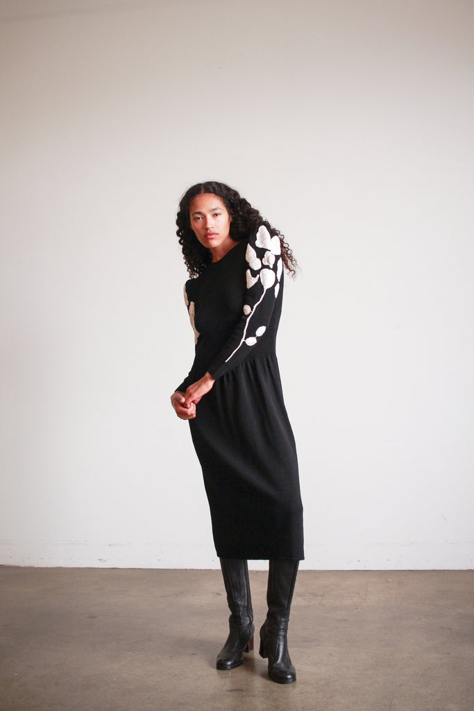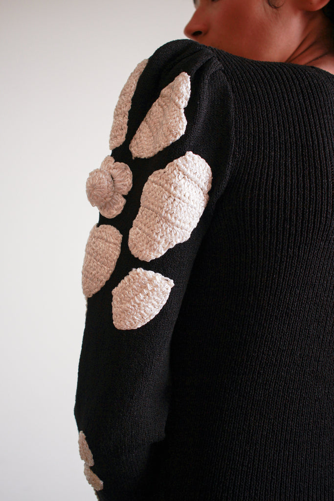 Circa 1980s. Label reads Pat Sandler for Wellmore. Size marked 8; fits up to S/M best. Silk blend. Light shoulder padding. Crochet floral detail along sleeves. Excellent condition.