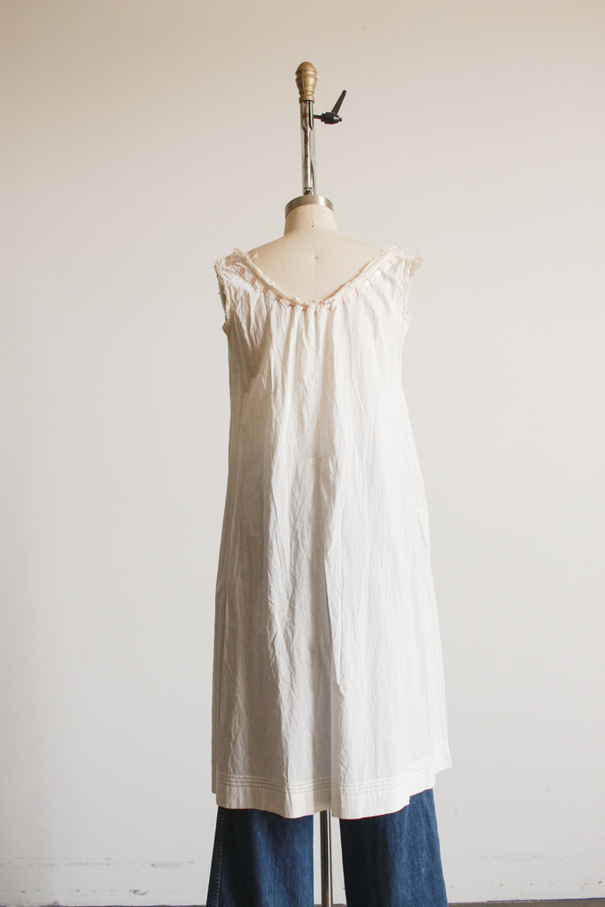 Circa 1910s. Cotton. Best fits M/L. Monogrammed with initials MEM. Lace insets and trim with pink threaded ribbon along neckline. No closures. Pintuck detail along skirt. Vented back. Great condition- minor discoloration consistent with age.