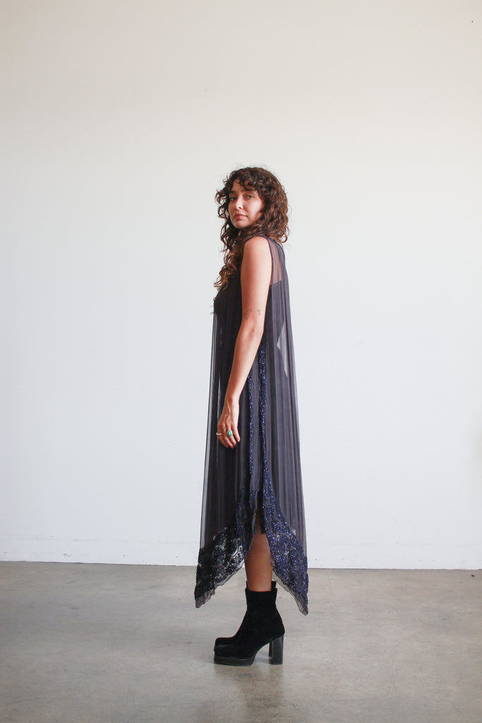 Circa 1920s. Silk chiffon fabric. Fits up to modern L. Blue glass beadwork throughout. Side and shoulder snap closures. Good condition- minor breaks and wear in fabric consistent with age. Minor missing beadwork along shoulder.