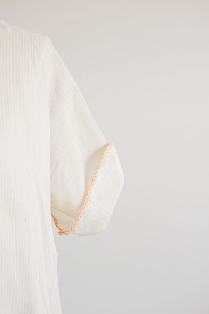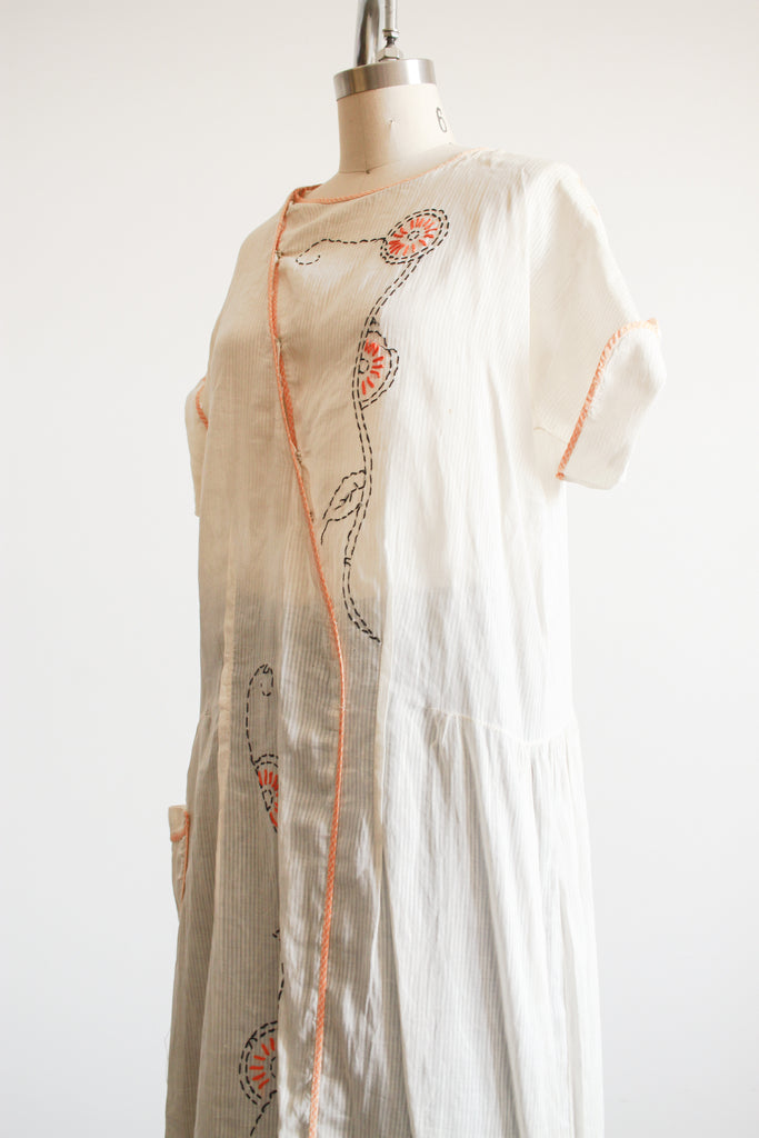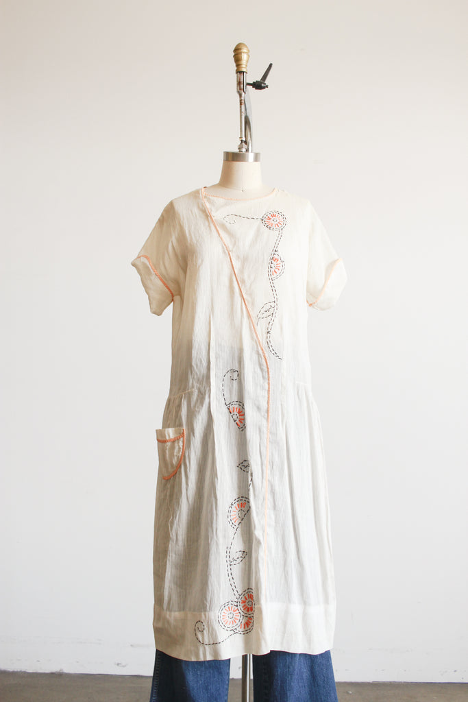 Circa 1920s. Cotton. Asymmetrical front snap closures. Best fits M/L. Stitched floral motif along the front. Striped fabric with orange plaid piping detail. Gathers along side of skirt. Good condition- signs of mending and discoloration, consistent with age.