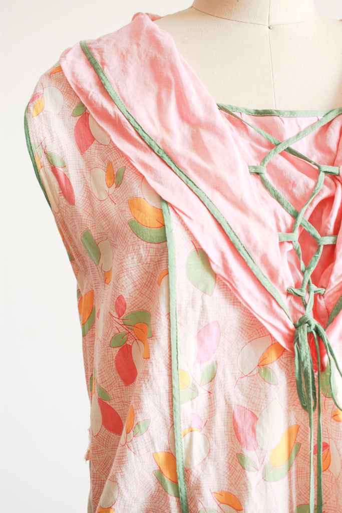 Circa 1920s. Cotton. Leaf print throughout. Fits up to M/L. Contrasting green piping and lace up detail. Sailor collar. Pockets. Great condition- some discoloration mainly along collar.