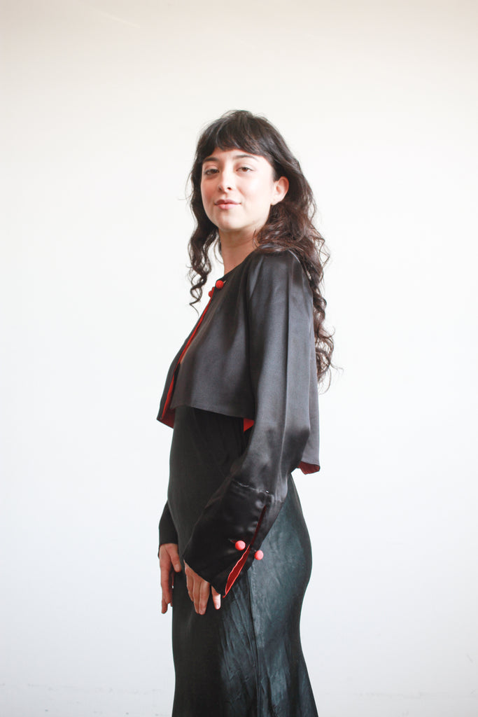 Circa 1930s. Silk satin. Fits up to M. Cropped silhouette with bell sleeves. Covered button detail at chest and sleeves. Lined in red silk. Great condition- minor breaks in fabric along back of neck, consistent with age.