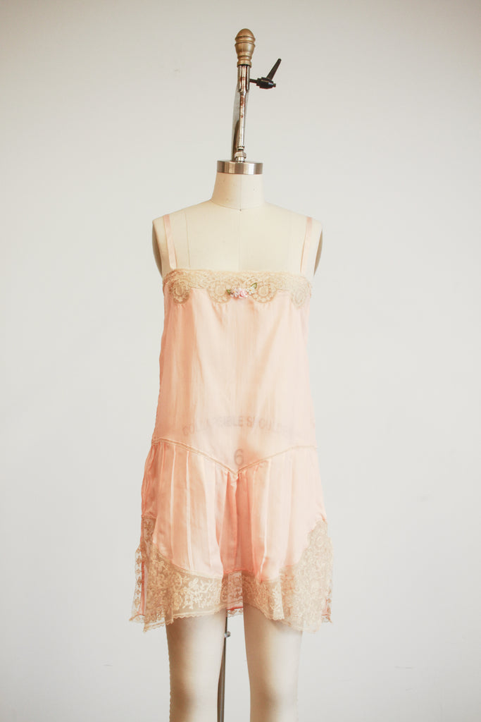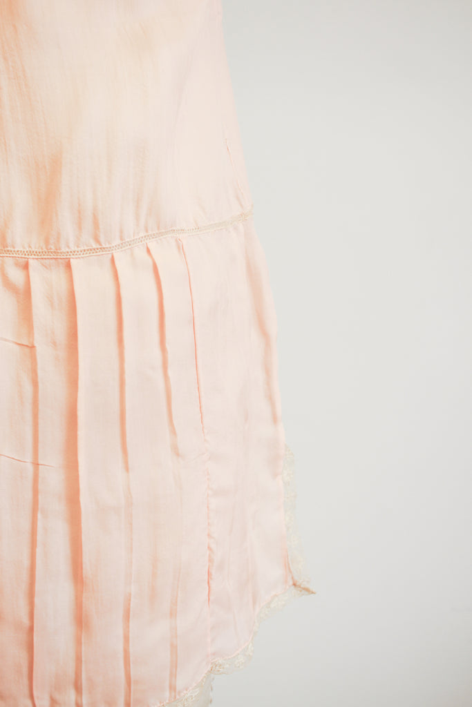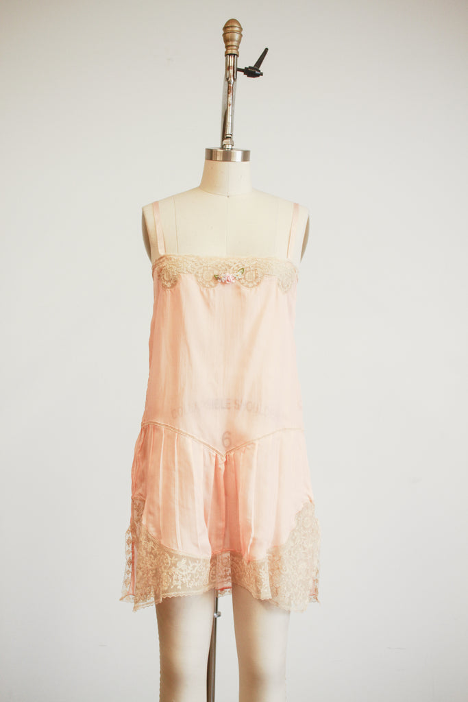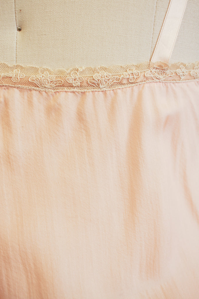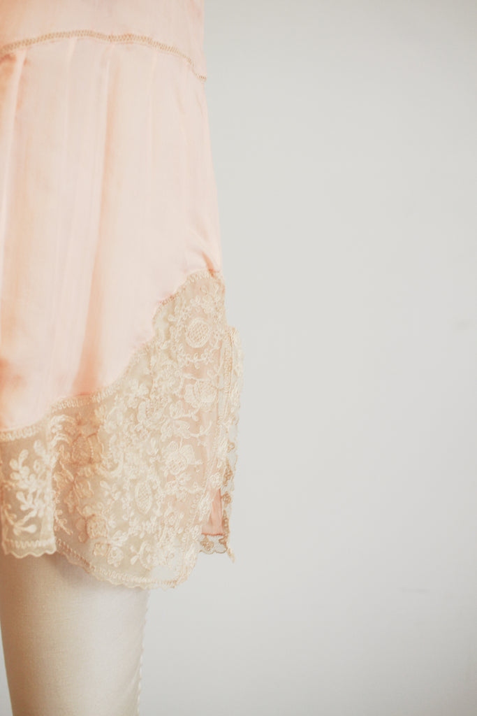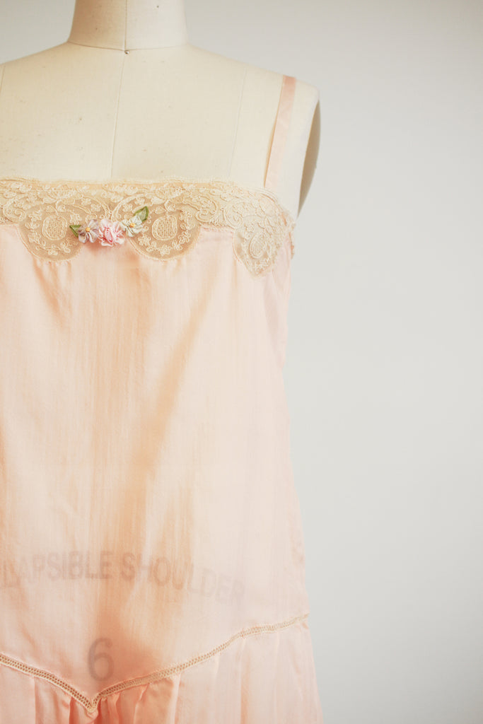 1920s Peach Silk Tambour Lace Inlay Slip Dress
