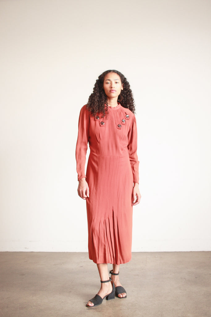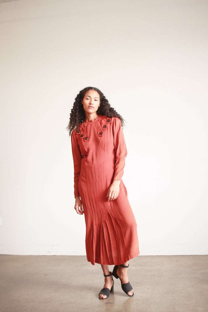 Circa 1930s. Rayon fabric. High neck. Button collar detail. Pleating. Covered back buttons. Side snap closures. Great condition- slight fading consistent with age.