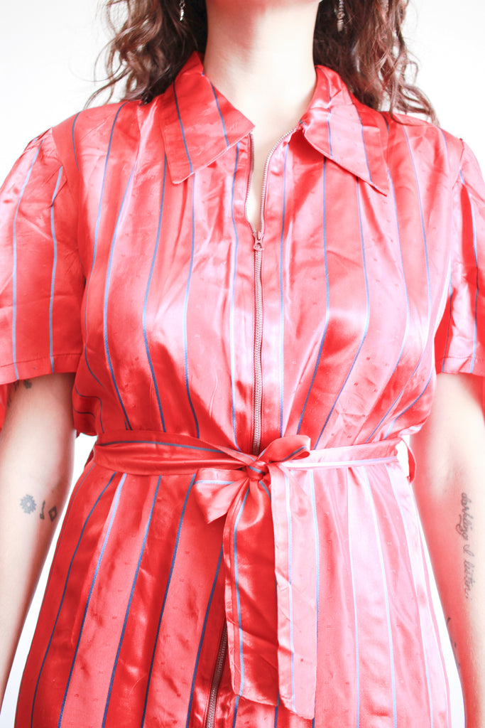 Circa 1940s. Label reads Styled by Peggy Jean. Rayon. Fits up to modern M. Blue stripe throughout. Zipper closure along front. Tie waist. Excellent condition.