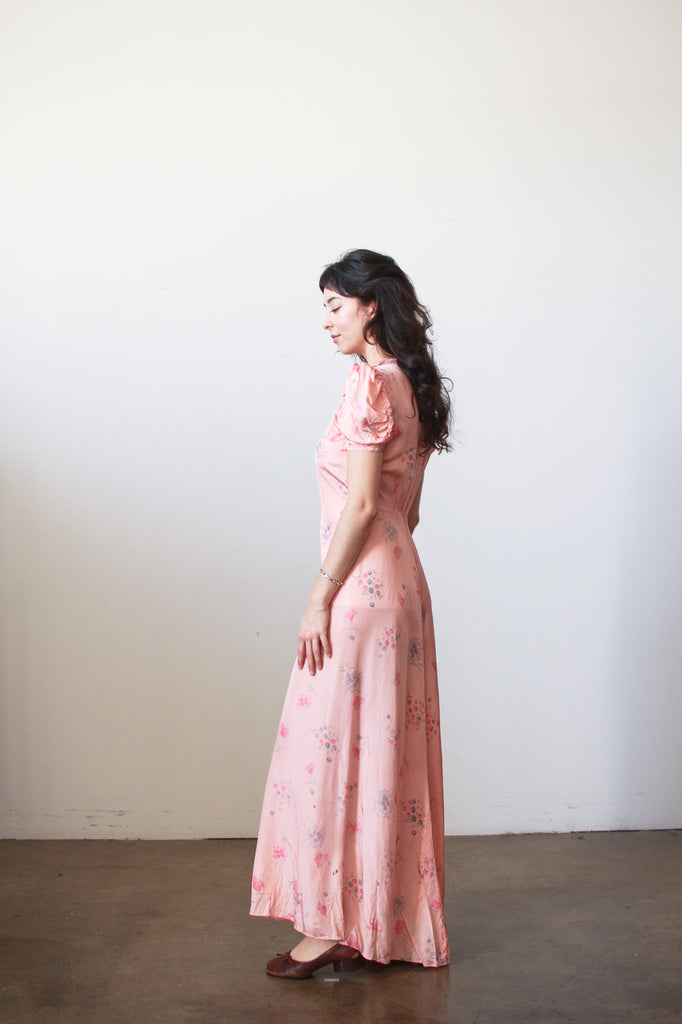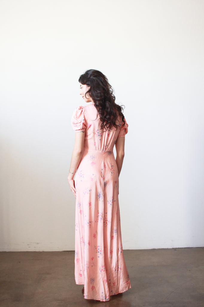 1940s Pink Cold Rayon Floral Puff Sleeve Dress
