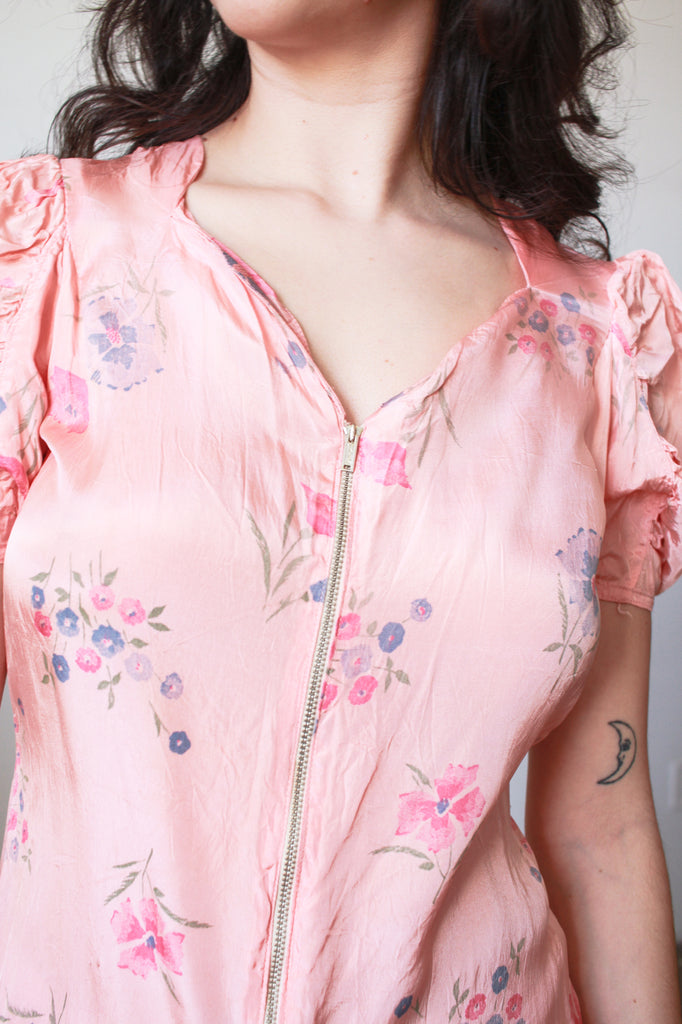 Circa 1940s. Rayon. Fits up to modern S. Blue and pink floral pattern throughout. Puff sleeves. Front zip closure. Great condition.