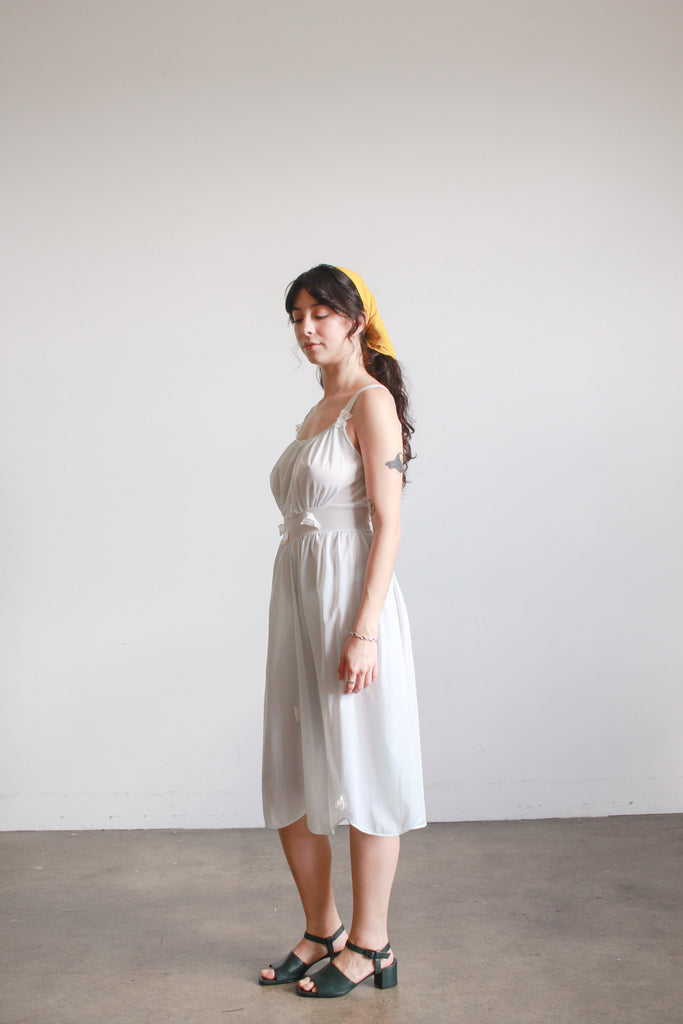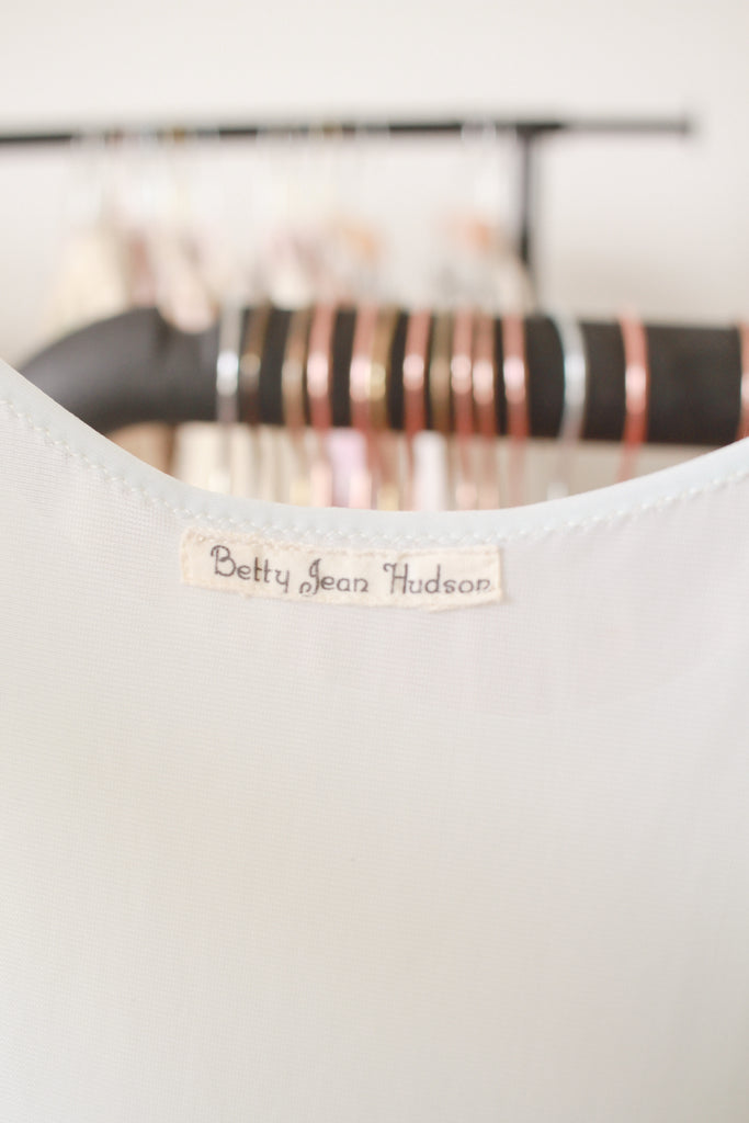 Circa 1950s. Label reads Betty Jean Hudson. Nylon. Size marked 34. Best fits XS/S. Flower applique details. Tie waist. Excellent condition, no flaws to note.