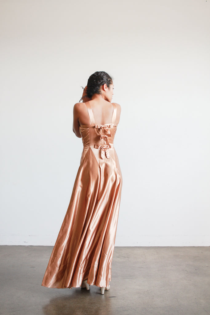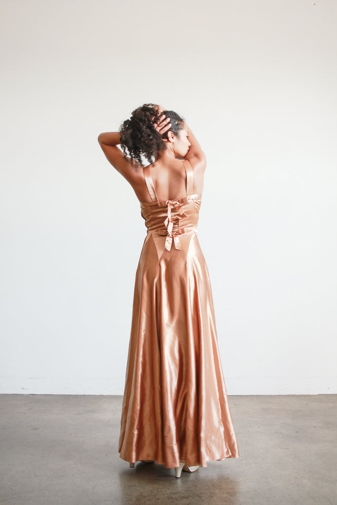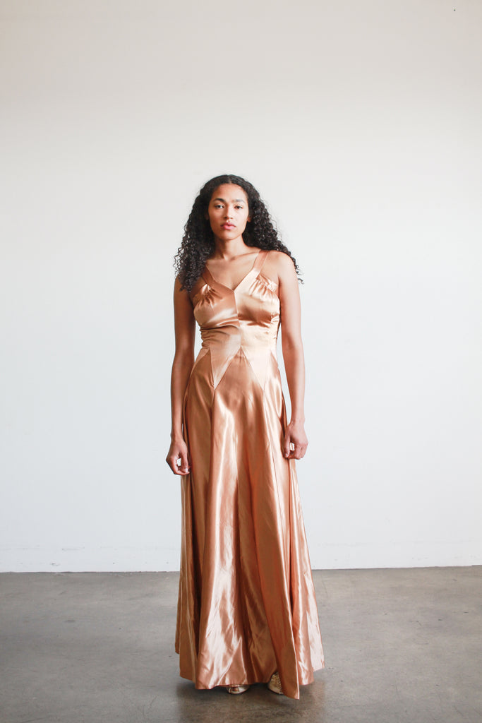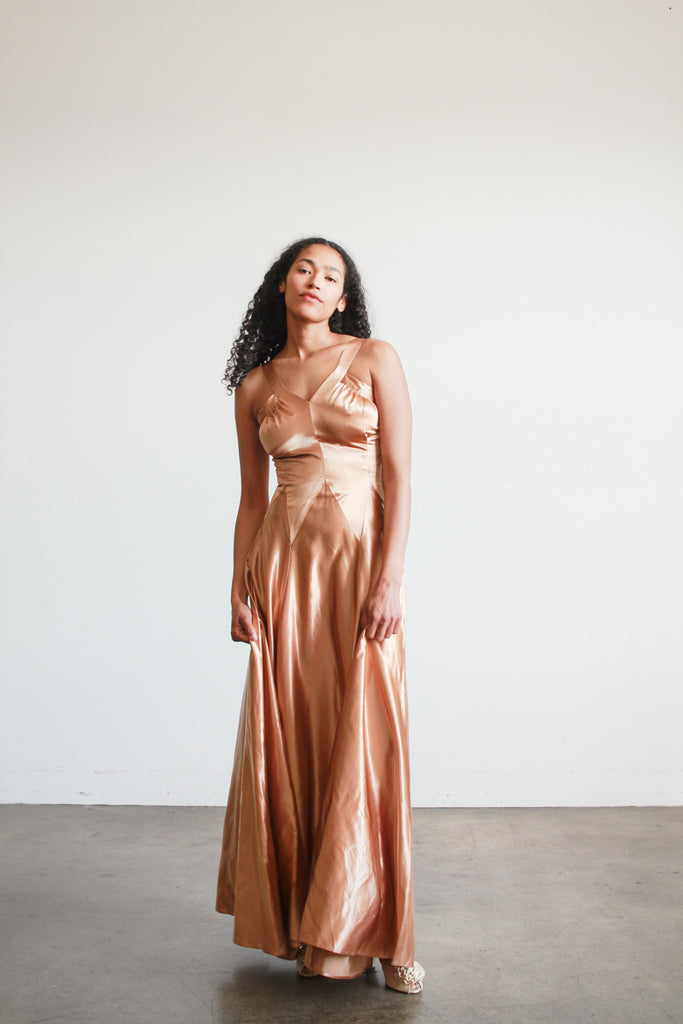 1940s Bronze Liquid Satin V-Neck Paneled Dress