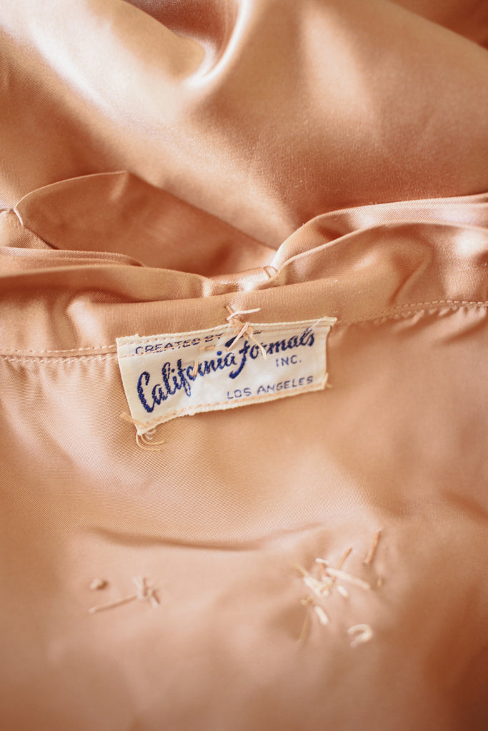 Circa 1940s. Label reads California Formals Los Angeles. Silk. Fits up to modern S. Sharp seam detail along the waist. Triple bow embellishments down the back. Side zip closure. Great condition- a few tears along skirt hidden by gathers.