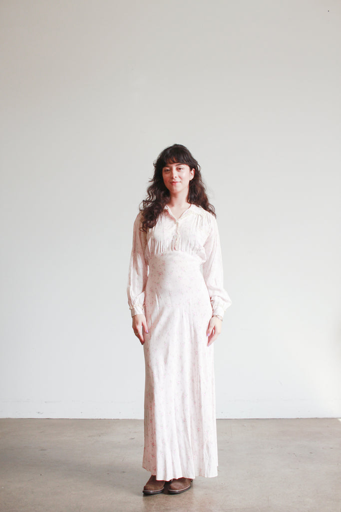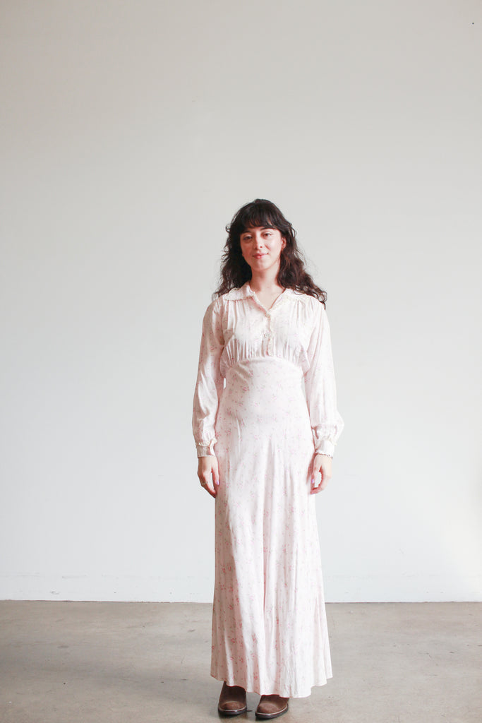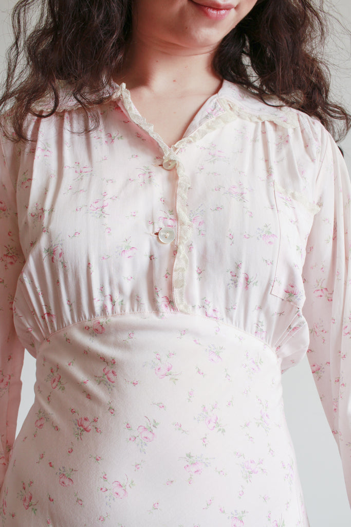 Circa 1940s. Cotton fabric. Label reads Mary Jane. Size marked 36. Fits up to modern S. Rosette pattern throughout. Lace trim and front pocket detail. Button front closures. Excellent condition.