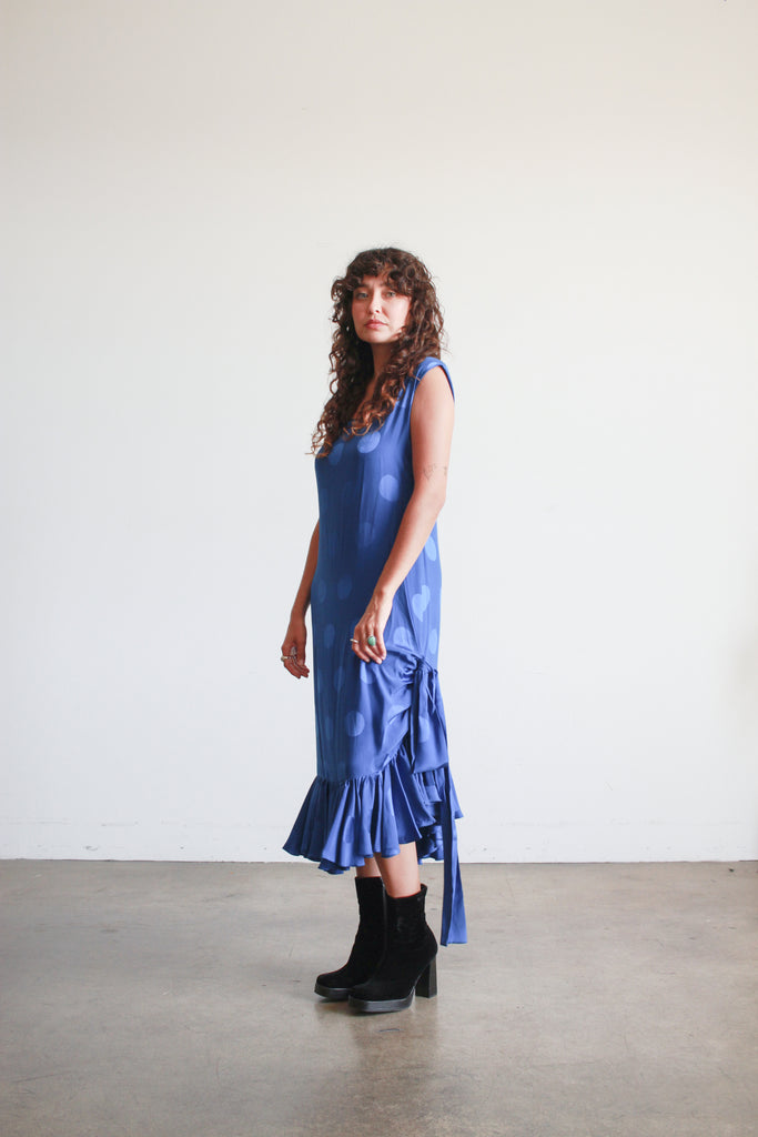Circa 1970s. Label reads Rose-Marie Roussel for Phillipe Pasteur. Size marked 10. Fits up to modern M. Silk. Ruffle hem with side tie detail. Covered buttons along back. Excellent condition.