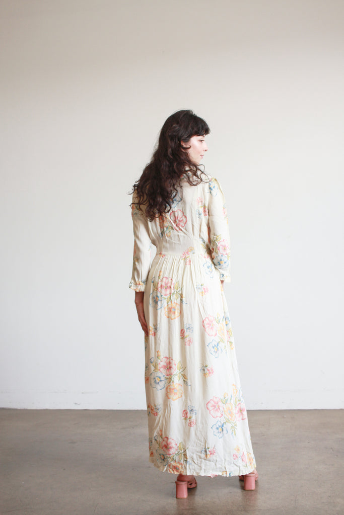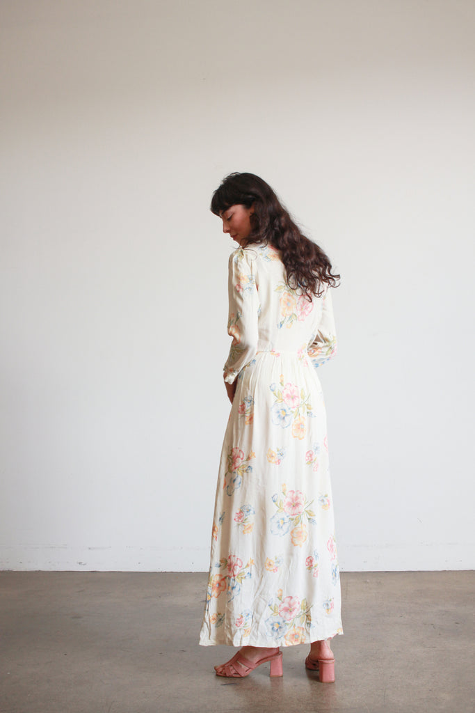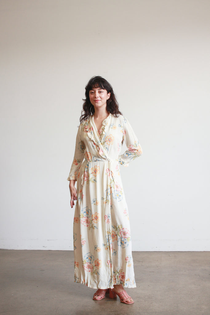 1940s Pale Yellow Floral Ruffle Wrap Dress
