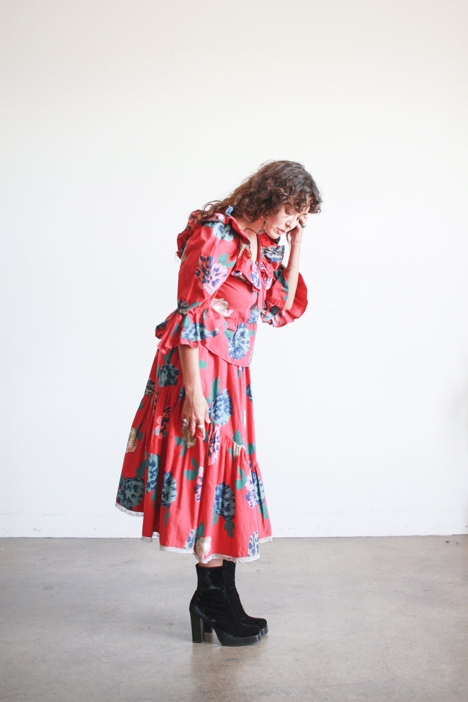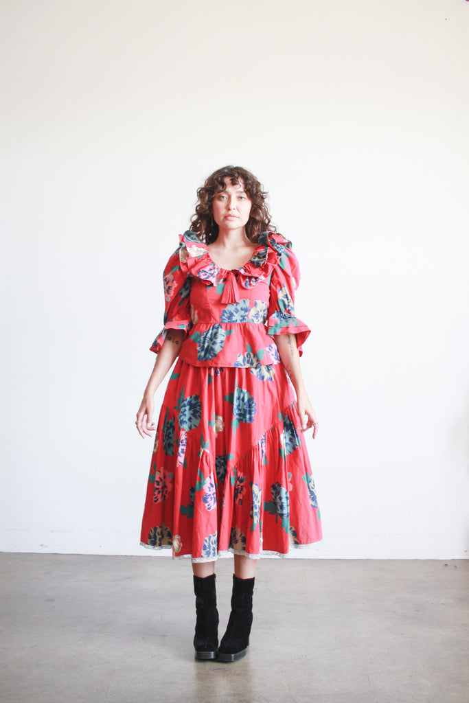 Circa 1980s. Label reads Bis Bis. Size marked 38. Fits up to modern S/M. Cotton. Ruffle details. Slight shoulder padding. Top has no closures. Back zip closure along skirt. Pockets. Excellent condition.