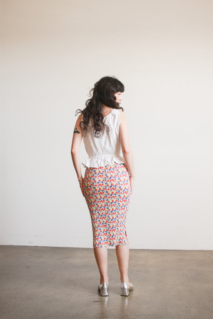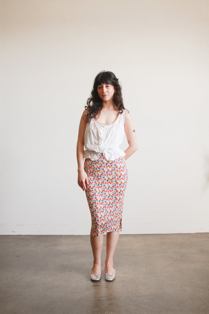 Circa 1980s. Polyester. Fits up to S. Pleated texture. Red, blue, yellow and gray floral pattern throughout. Elasticized waist. No closures. Excellent condition, no flaws to note.
