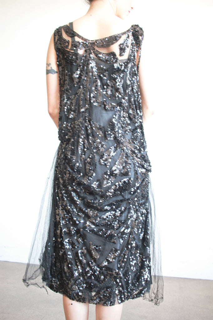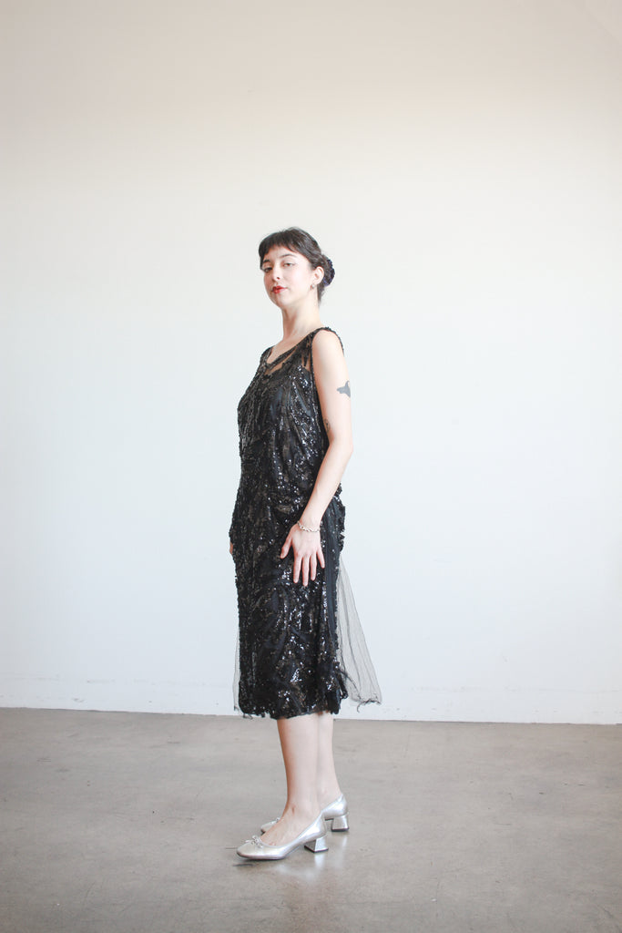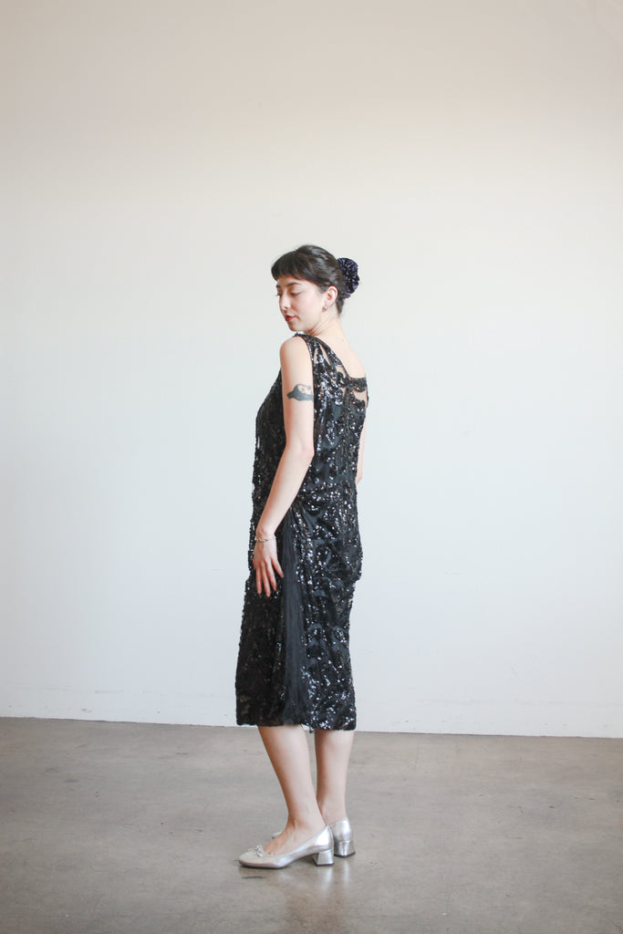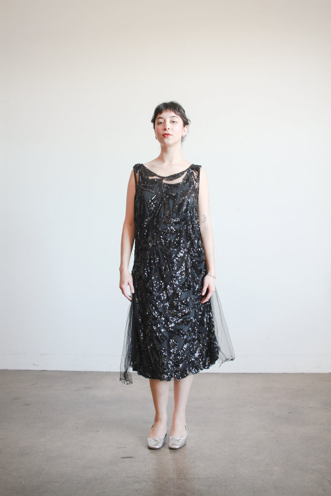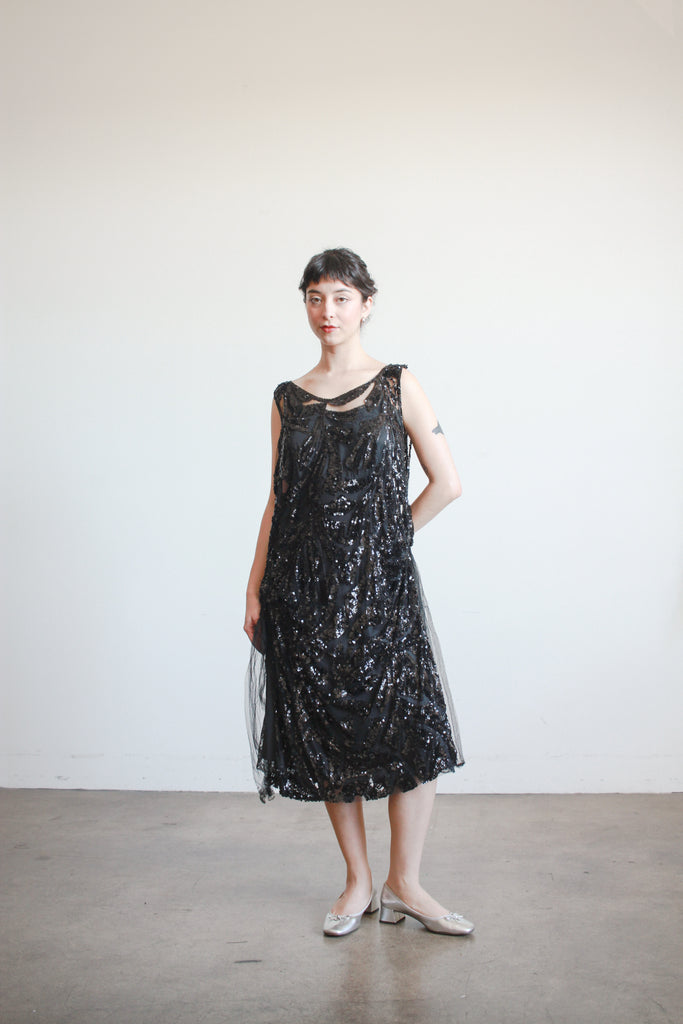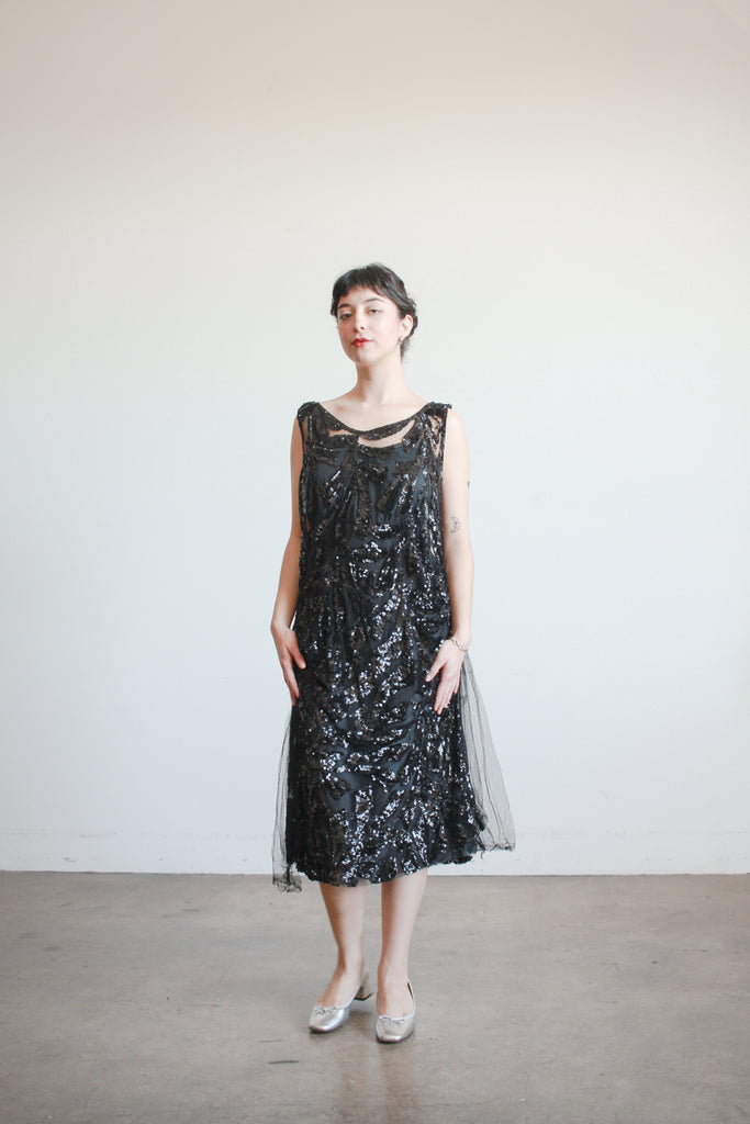 Circa 1920s. Fits up to modern L. Side slit. Sequined pattern throughout. Great condition- some wear and missing sequins consistent with age.