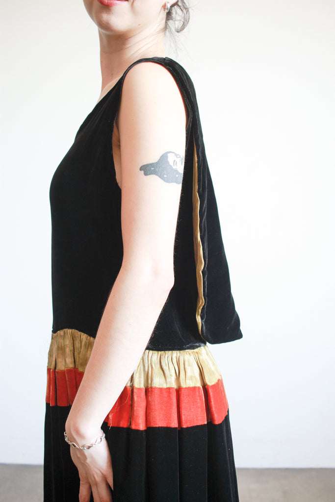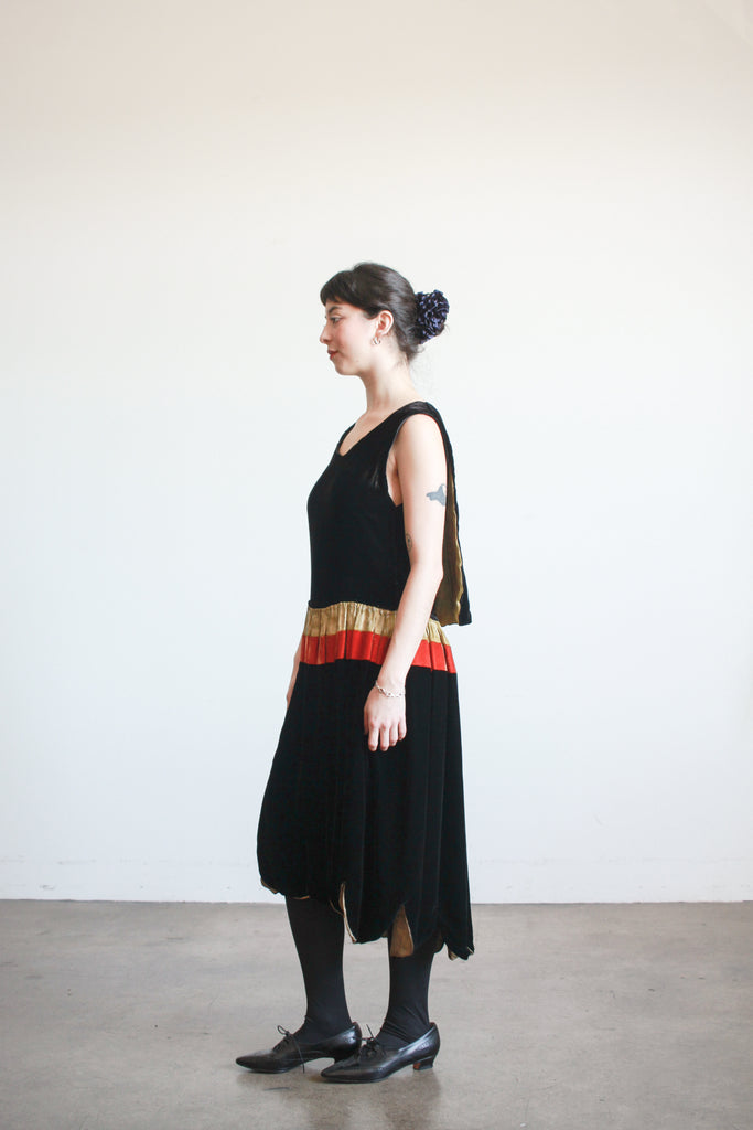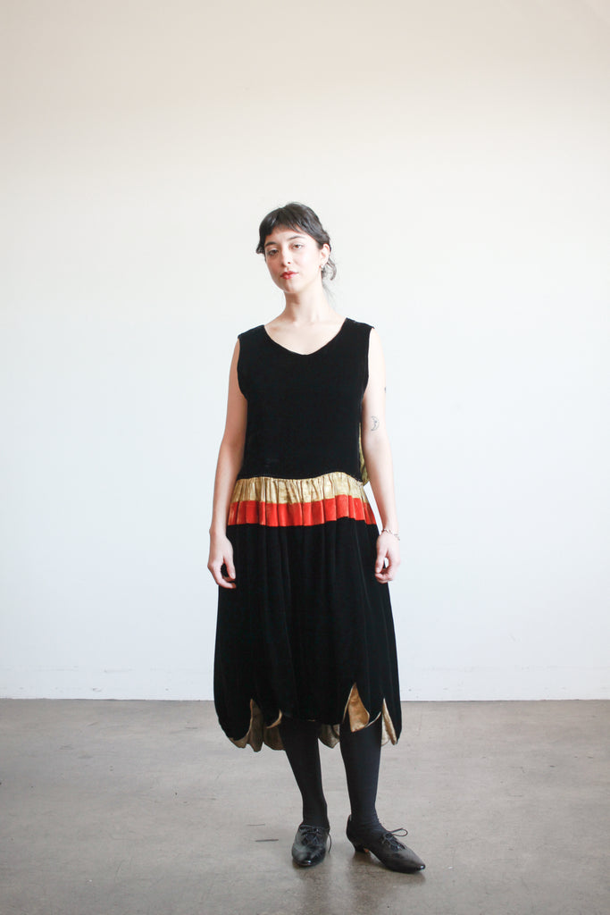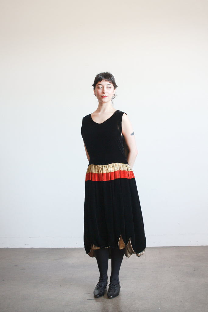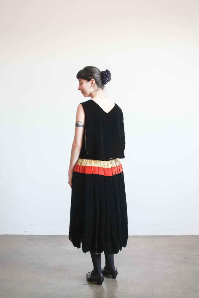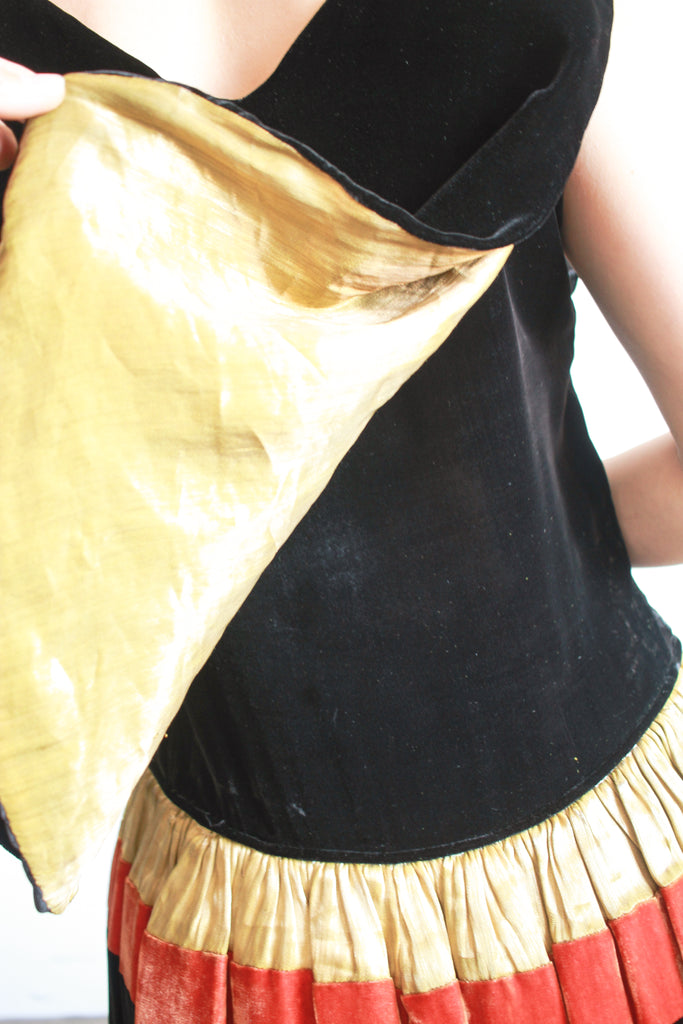 Circa 1920s. Silk velvet. Fits up to modern M. Side snap closures. Layered front. Scallop hem skirt. Orange and gold lamé accents along the waist. Lined. Great condition- slight fraying of lamé.